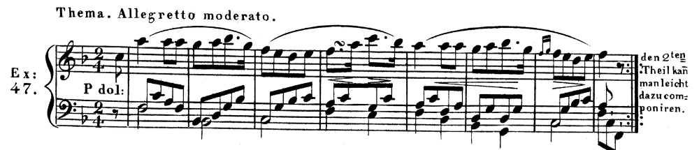 練習のために、以下は単純な主題の前半部分とさまざまな変奏の例であり、学習者が完成させる必要がある(例47)。
