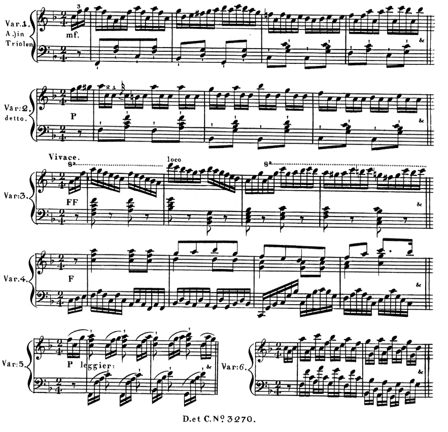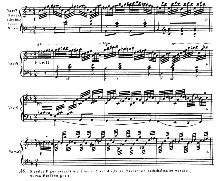 優れたピアニスト(フンメル、モシェレス、カルクブレンナー、リースら)による模範となり得る変奏曲の数々は今や膨大であり、演奏者はこれらの中から最大限の選ぶことができる。この種の作品を数多く知り、可能な限り深く学ぶほど、この領域における演奏者のファンタジーと独創性は研ぎ澄まされ、発展するであろう。
