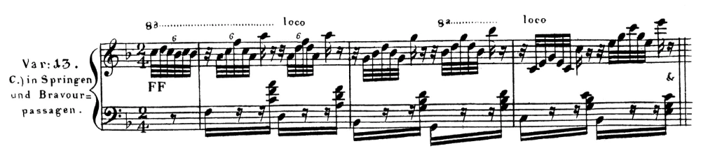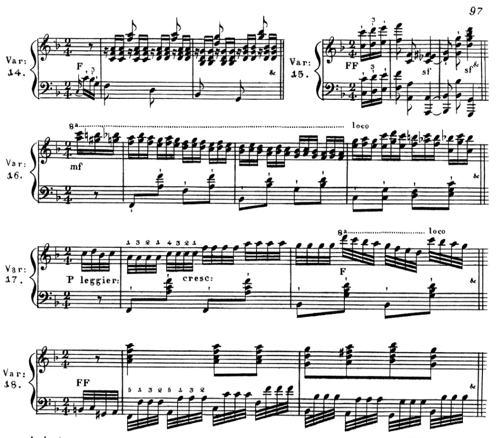 18変奏までは「跳躍進行と華麗なパッセージ」を用いたものと書かれています。