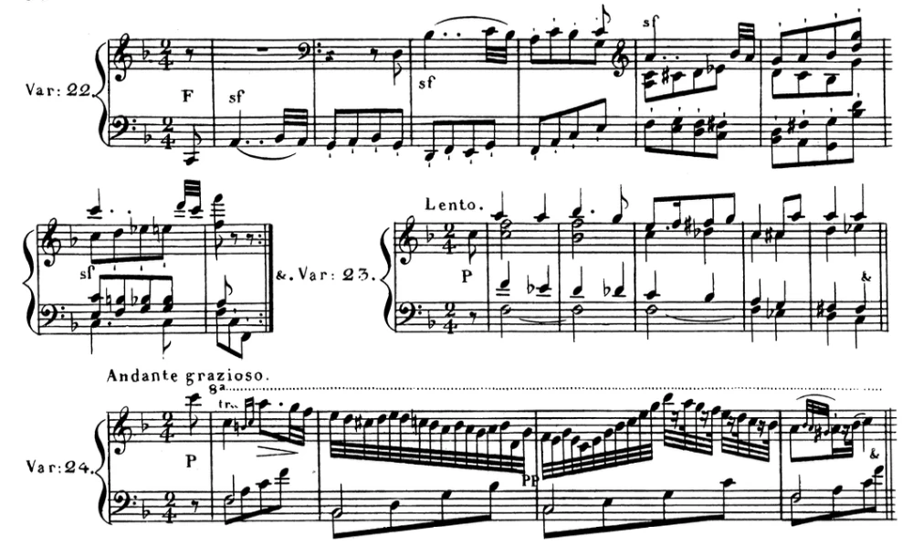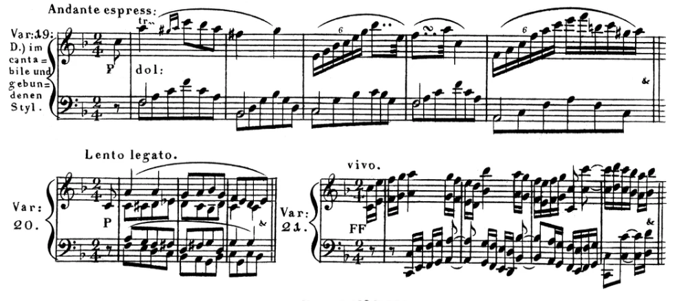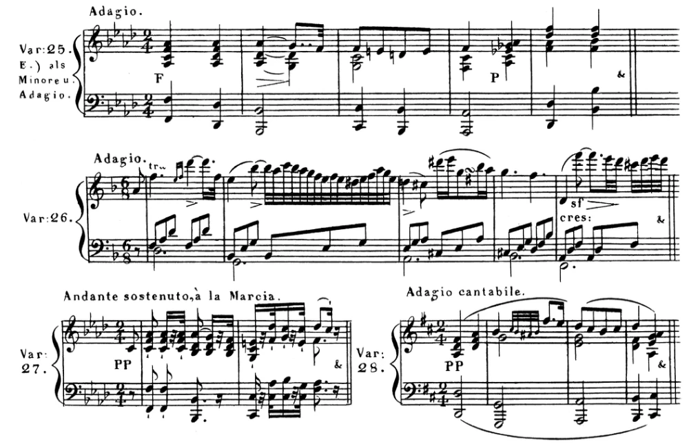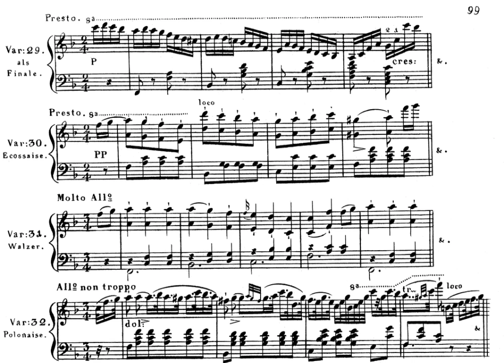 24変奏まではカンタービレな、あるいは模倣的な様式での変奏が書かれています。25変奏以降は、短調(そしてアダージョ)にしたヴァージョン(25、26変奏)、マーチ(27変奏)、フィナーレ(最終変奏、29変奏)、エコセーズ(30変奏)、ワルツ(31変奏)、ポロネーズ(32変奏)と続きます。